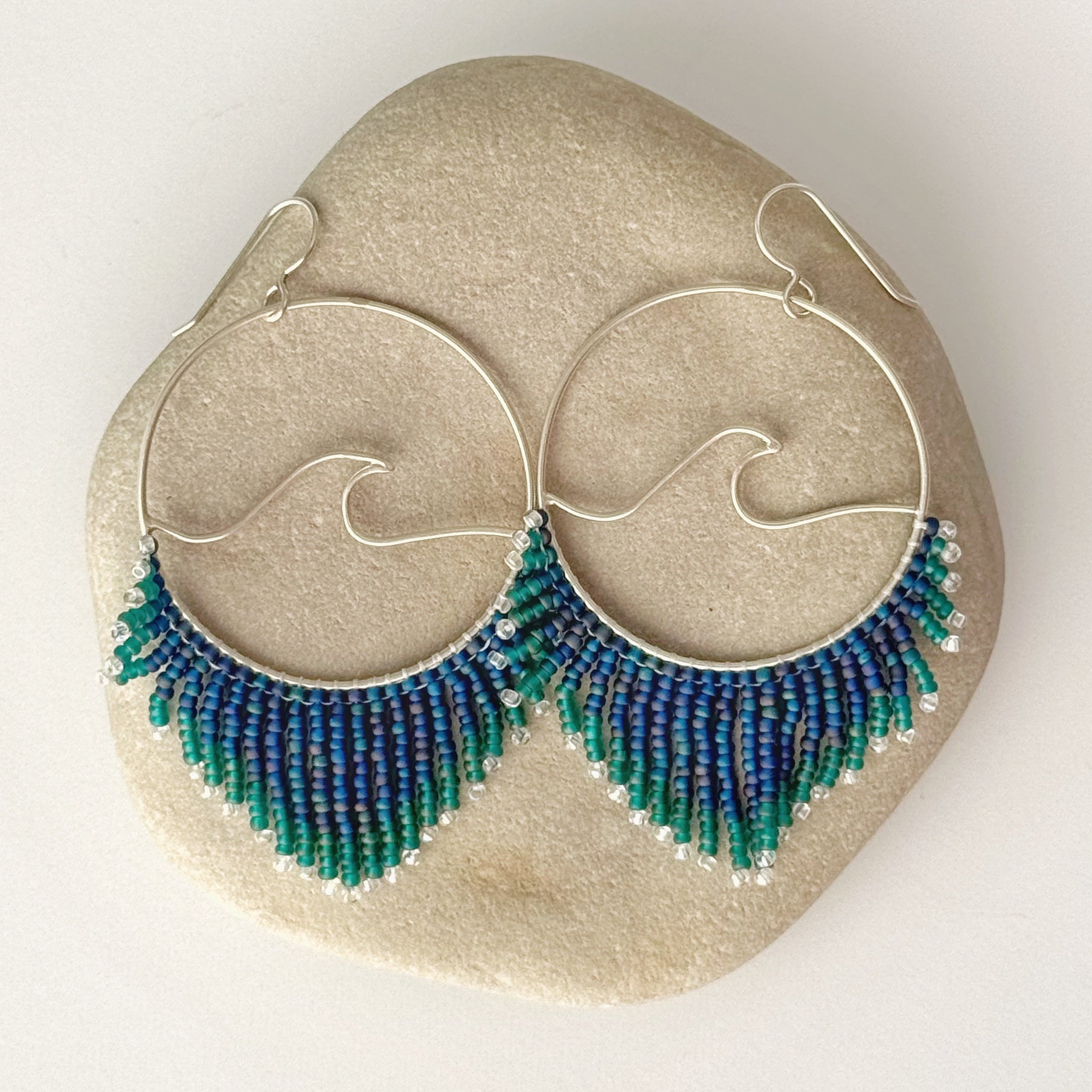 These handmade hoop earrings are handcrafted in sterling silver with a soft wave-inspired design and finished with delicate hand-beaded fringe. The fluid curves echo the movement of water, while the fringe adds texture and gentle motion. Elegant and expressive, this pair balances sculptural form with organic detail.